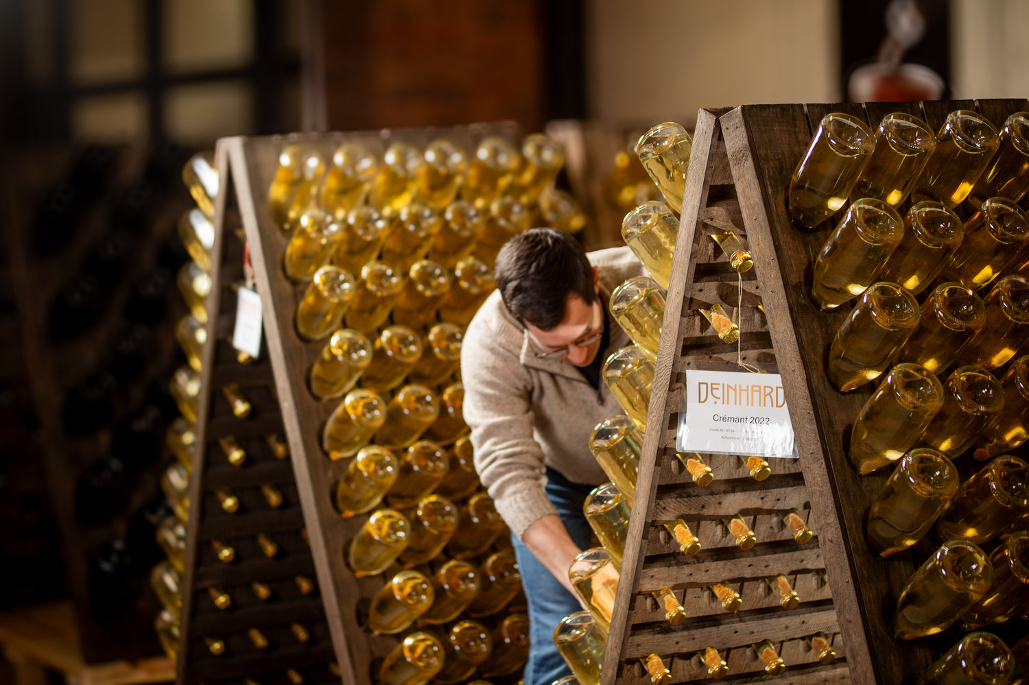 David (links) und Philipp (rechts) sind die beiden Sektmacher, die jeden Schritt des Prozesses begleiten – vom Weinberg bis zum fertigen, degorgierten Sekt. David ist seit 2020 für die Deinhard-Sekte verantwortlich und hat die Grundlage geschaffen, um künftig alle Sekte nach der traditionellen Flaschengärung zu produzieren. Seit Ende 2024 verstärkt Philipp das Team. Gemeinsam arbeiten sie unermüdlich daran, die Qualität des Deinhard-Sektes weiter zu verbessern. Ein engagiertes Team steht hinter den beiden und unterstützt sie tatkräftig bei den zahlreichen Arbeitsschritten der