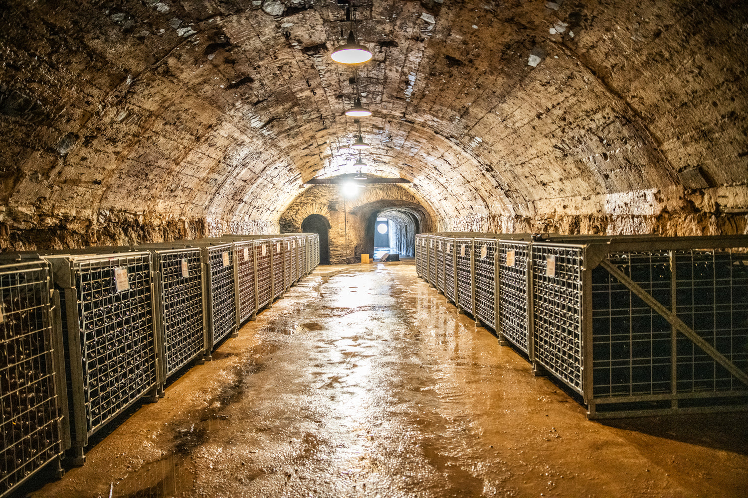 Sobald die zweite Gärung abgeschlossen ist und die Flaschen einen Druck von etwa 6 bar erreicht haben, bringen wir sie in unseren Felsenkeller. Dieser befindet sich nur wenige Meter neben unserer Manufaktur und wurde vor über 200 Jahren in den Schiefer unter dem Bernkastler Schlossberg gehauen. Hier können unsere Rohsekte im Dunkeln und bei konstant kühler Temperatur reifen. Unsere Traditionssekte lagern mindestens 9 Monate, alle anderen Sekte mindestens 24 Monate auf der Flasche.