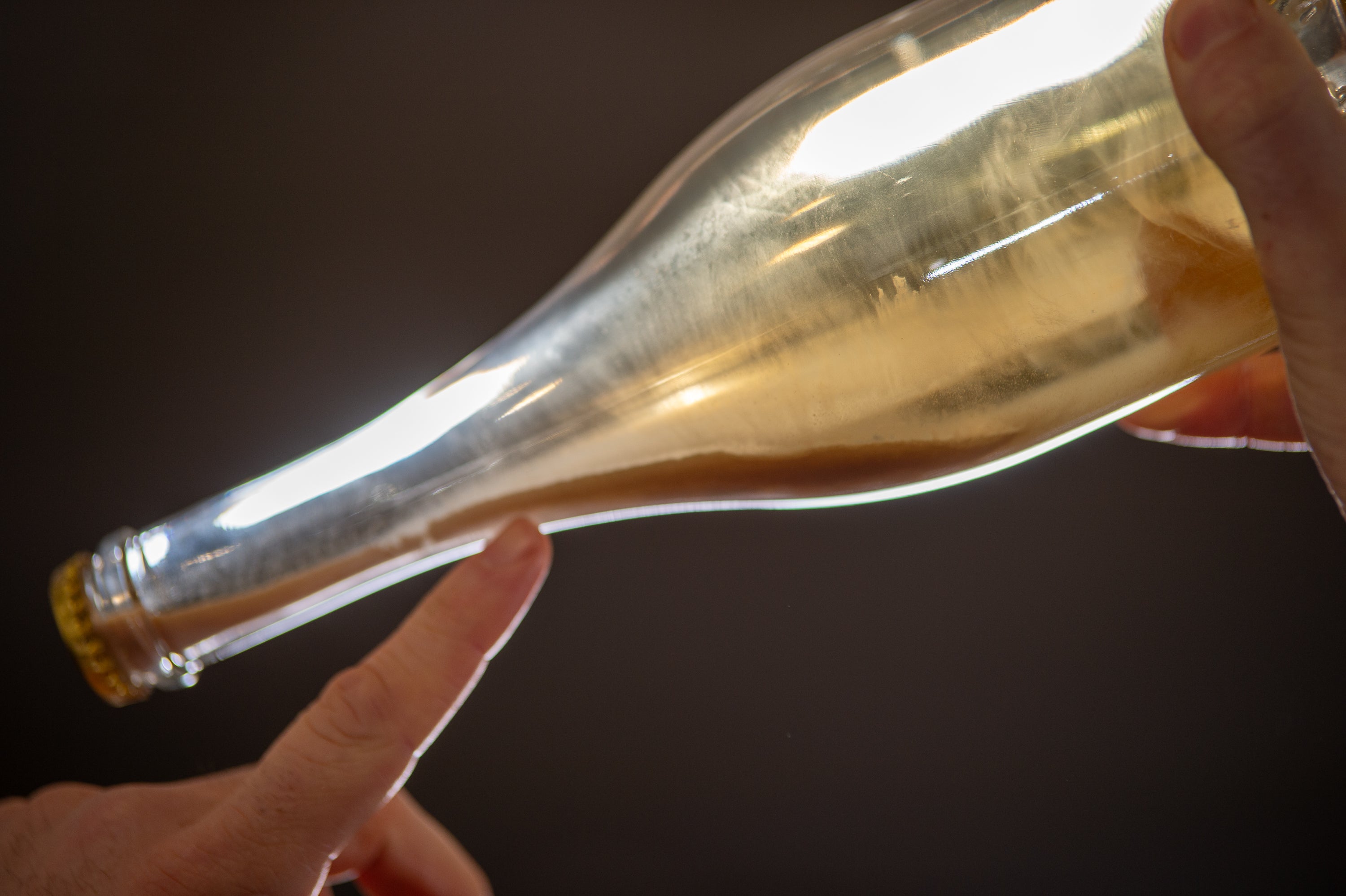 Das Hefedepot, das sich im Flaschenhals befindet, wird beim Degorgieren entfernt. Dafür werden die Flaschen kopfüber in ein Eisbad gestellt, sodass der obere Teil des Flaschenhalses, in dem die Hefe sitzt, eingefroren wird. Anschließend kann die Flasche umgedreht und mit einem Degorgierhaken geöffnet werden. Durch den Überdruck in der Flasche wird der gefrorene Hefepropfen herausgeschleudert. Zurück bleibt ein klarer Schaumwein ohne Restsüße, auch bekannt unter Brut Nature.